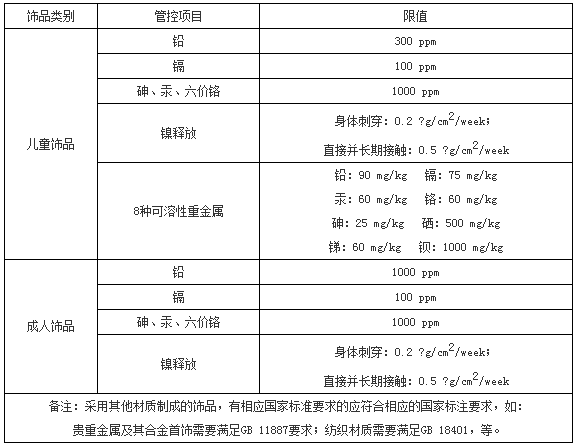 除了對(duì)普通金屬飾品有管控之外,我國對(duì)貴重金屬飾品中的有毒有害物質(zhì)也有管控,如標(biāo)準(zhǔn)GB 11887-2008《首飾 貴金屬純度的規(guī)定及命名方法》。該標(biāo)準(zhǔn)規(guī)定了有害重金屬鉛、鎘、汞、砷、六價(jià)鉻及鎳釋放的限量要求。