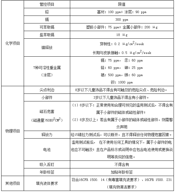 基于美國消費品安全委員會與D&D Distributing-Wholesale 公司聯(lián)合宣布對中國產(chǎn)兒童飾品實施自愿性召回事件,2011年11月7日,美國材料與試驗協(xié)會(ASTM)發(fā)布了關(guān)于兒童飾品的標準ASTM F 2923 -2011。該標準僅適用于供12歲及以下兒童使用的飾品,不適用于玩具類產(chǎn)品。標準不僅限制了產(chǎn)品中多種重金屬含量,包括鉛、鎘、鎳釋放、可溶性重金屬,還對其物理機械性能做了要求。另外,該標準已于2012年12月在羅德島州強制實施。