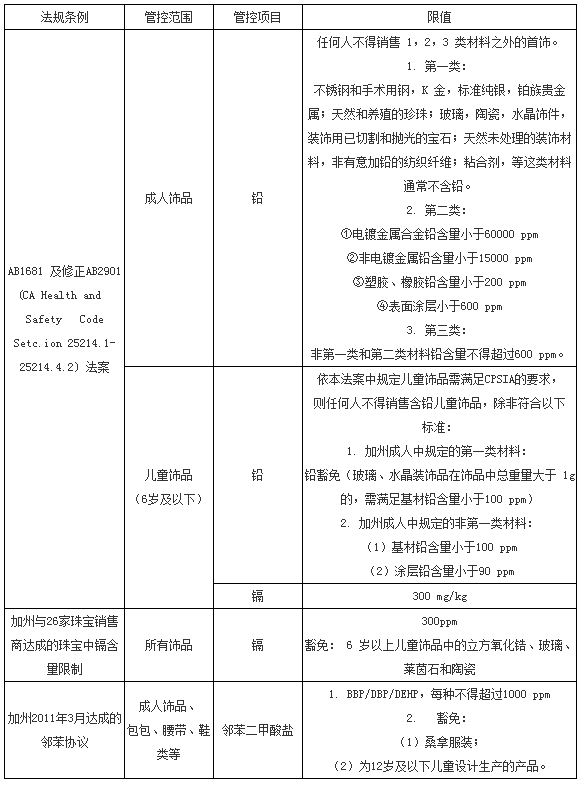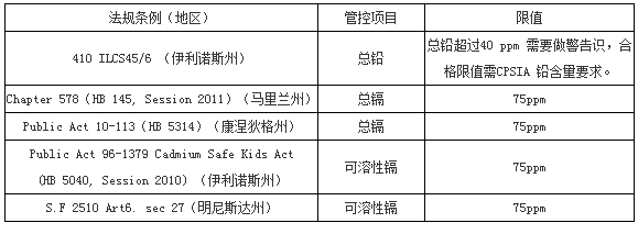 美國其他部分州對飾品有害物質(zhì)立法也獲得通過,如伊利諾斯州鉛中毒預防法案,馬里蘭州和康涅狄格州飾品中的總鎘含量不得超過75ppm,伊利諾斯州和明尼斯達州飾品中的可溶性鎘不得超過75ppm。